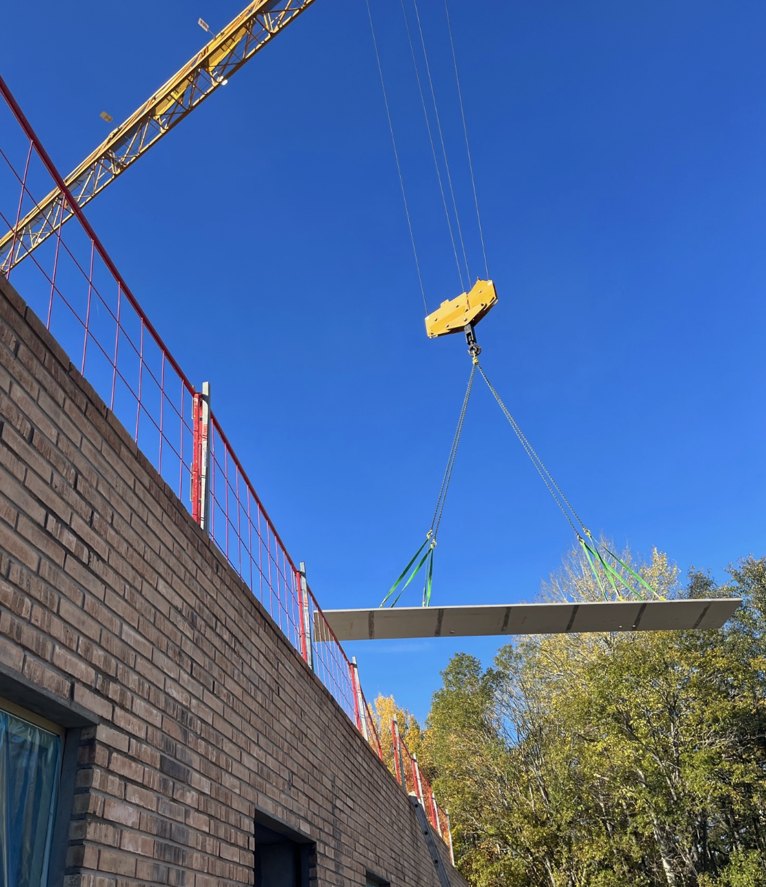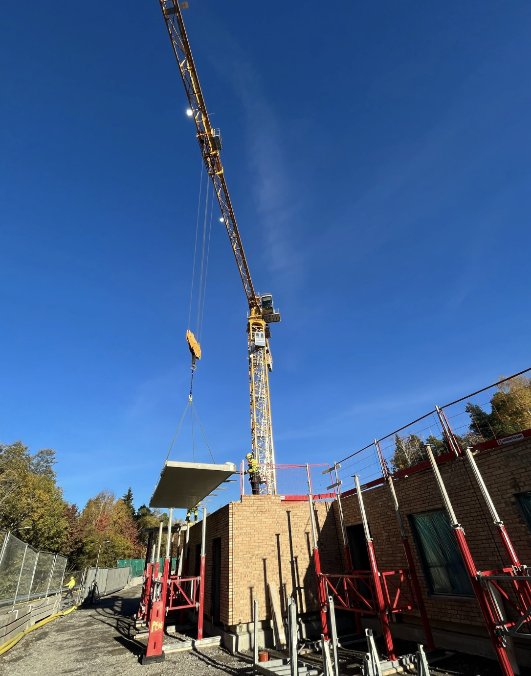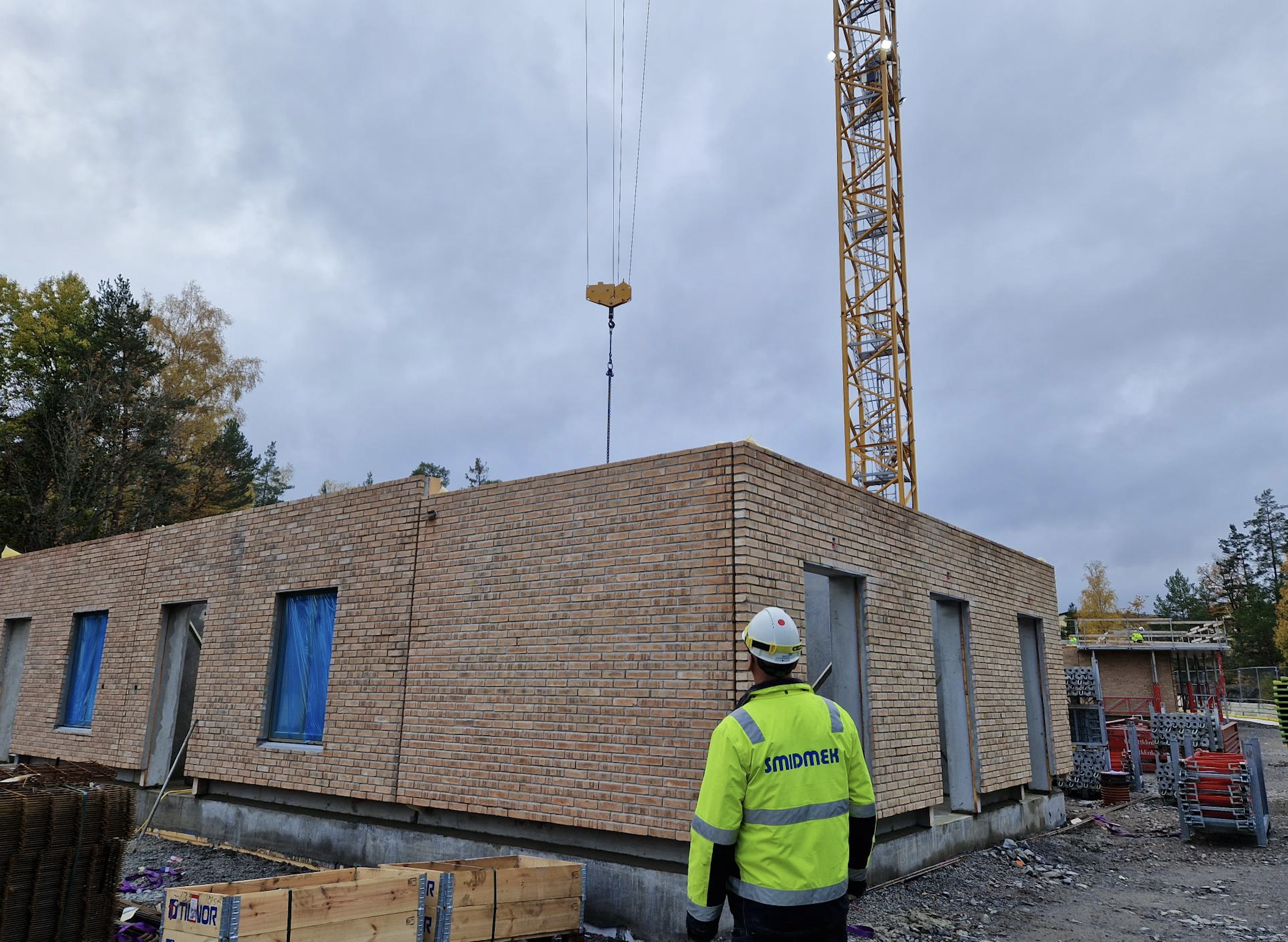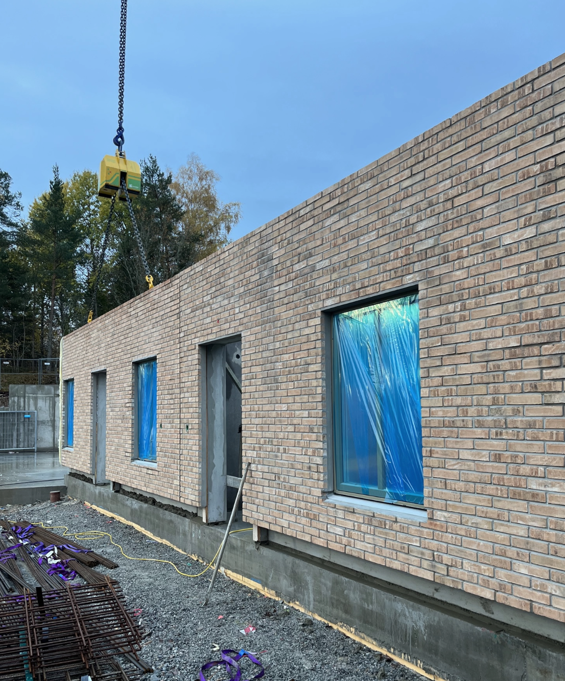 Fasaderna består av sandwichväggar med ytterskivor av ingjutet tegel och lättklinkerbetong som putsas på plats. Montage planeras börja oktober 2022 och 2023 är stomresningen klar.