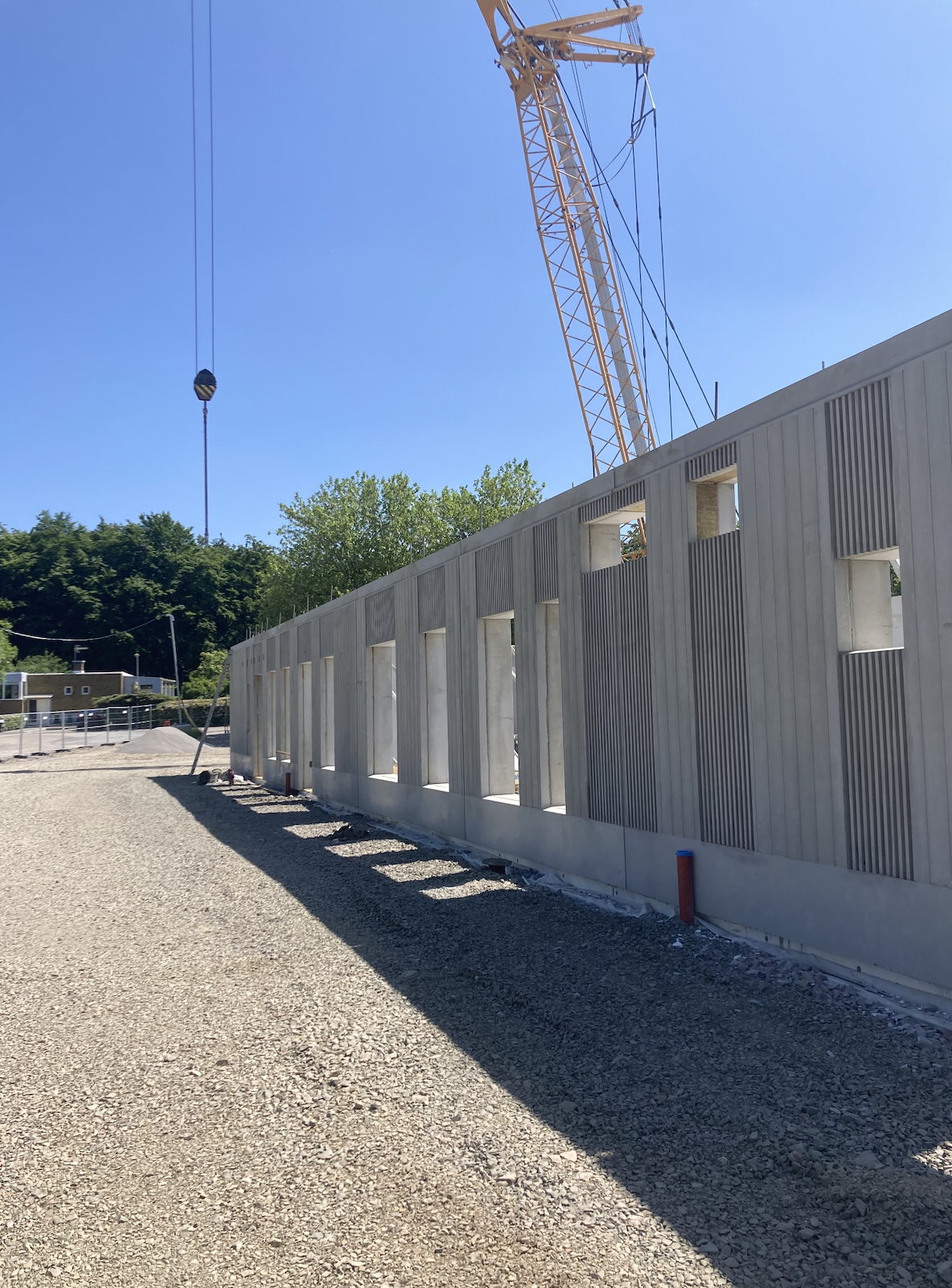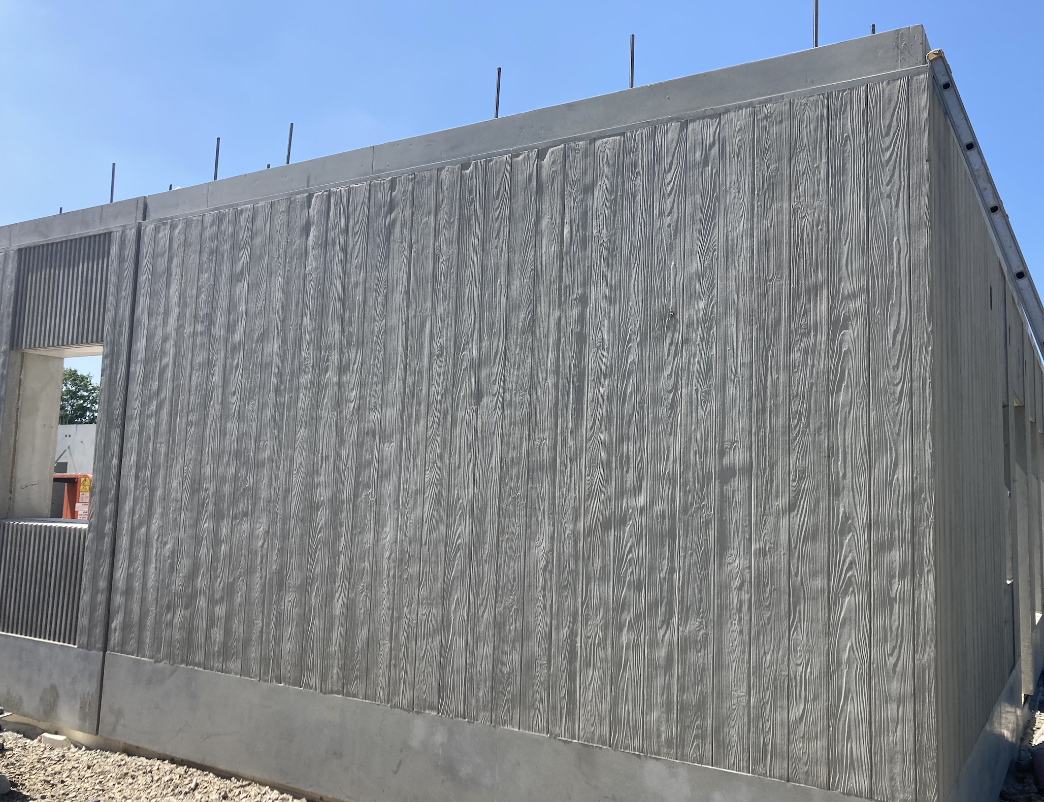 Fasaden på första våningen utförs med matriselement för att få betongen att efterlikna träpanelen på andra våningen.