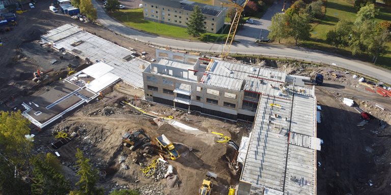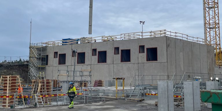 På Västerhöjden i Hofors monteras betongstommen till ett modernt äldreboende som ska rymma 80 lägenheter i två sammanlänkade huskroppar.